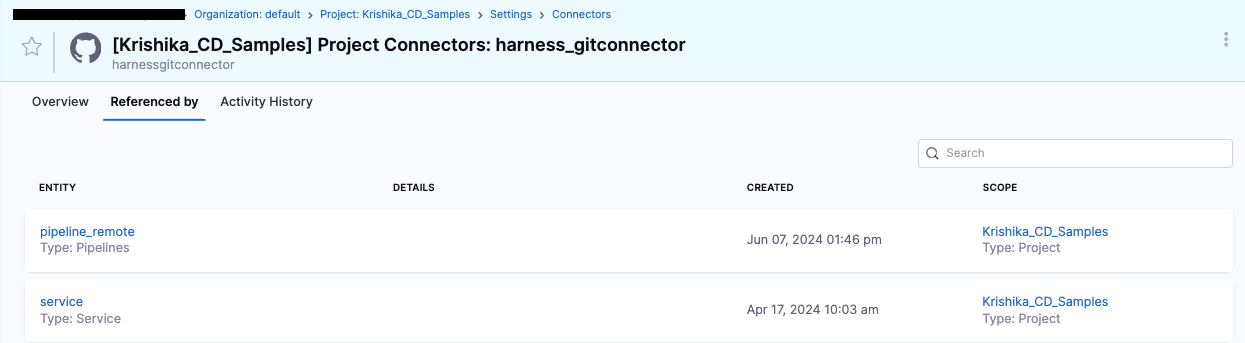 For example, if you store your entities—such as Pipelines, Services, Environment, Input Set, or Templates—in the default branch (for example, main or master), they will appear in the Referenced By section. If a pipeline is using a connector, the connector will list the pipeline as a reference if the pipeline is stored remotely in the default branch or INLINE. However, if the pipeline is saved in a non-default branch, no reference will be created in the Referenced By section.