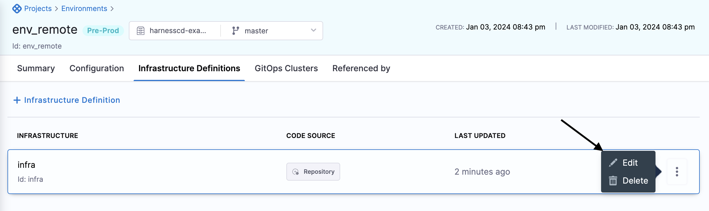 8. For the new infrastructure definition, select More Options (⋮) and then select Edit.