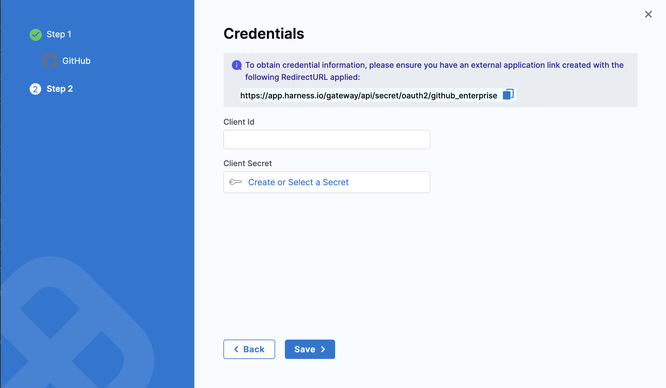 Copy the Redirect URL provided on the Harness Credentials page.