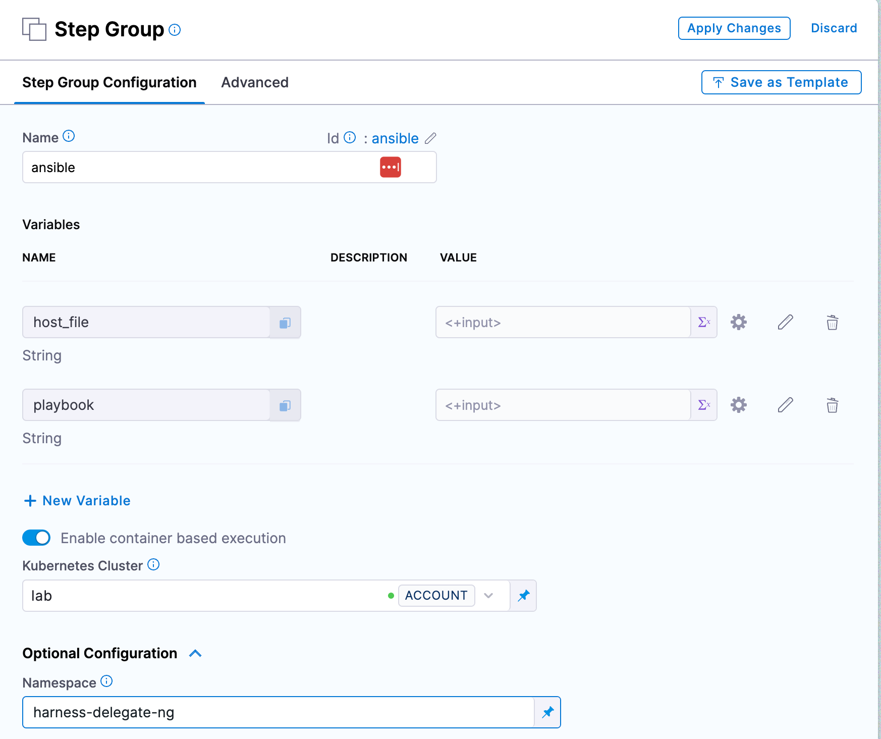 Select your Kubernetes connector where you want the pipeline to run, and expand the optional configuration step to specify a specific namespace for the ansible container to run in.