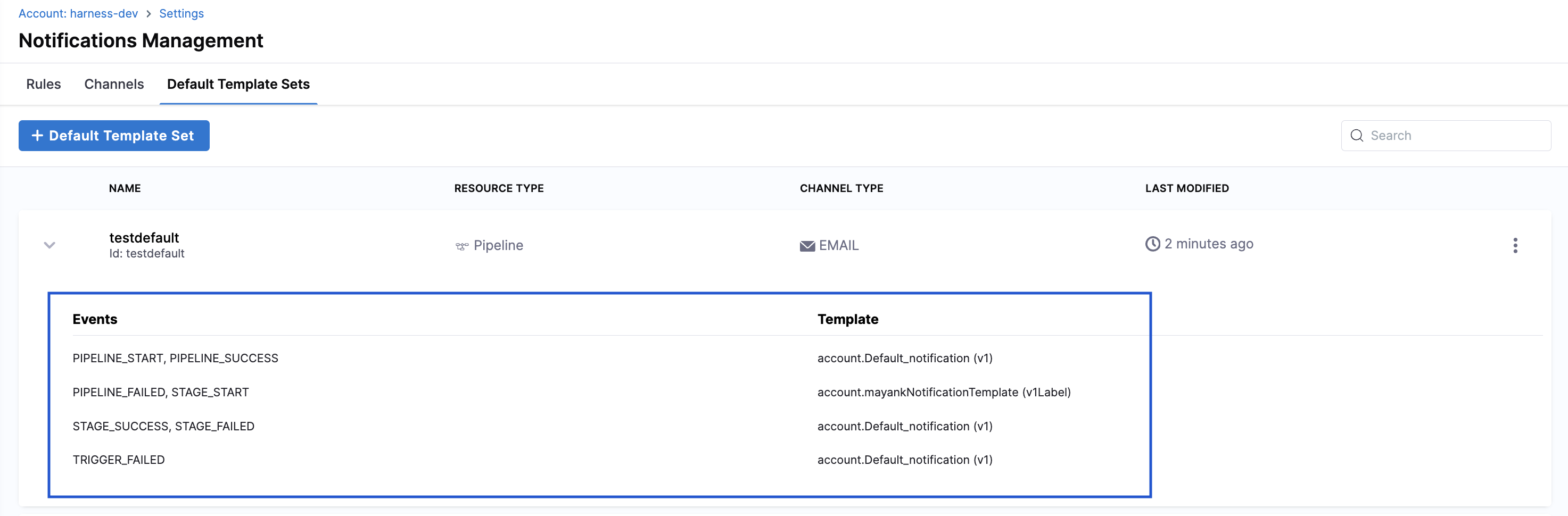 The Default Notification Template feature requires the PL_DEFAULT_NOTIFICATION_TEMPLATE_SET_SUPPORT feature flag. Contact Harness Support to enable this feature.