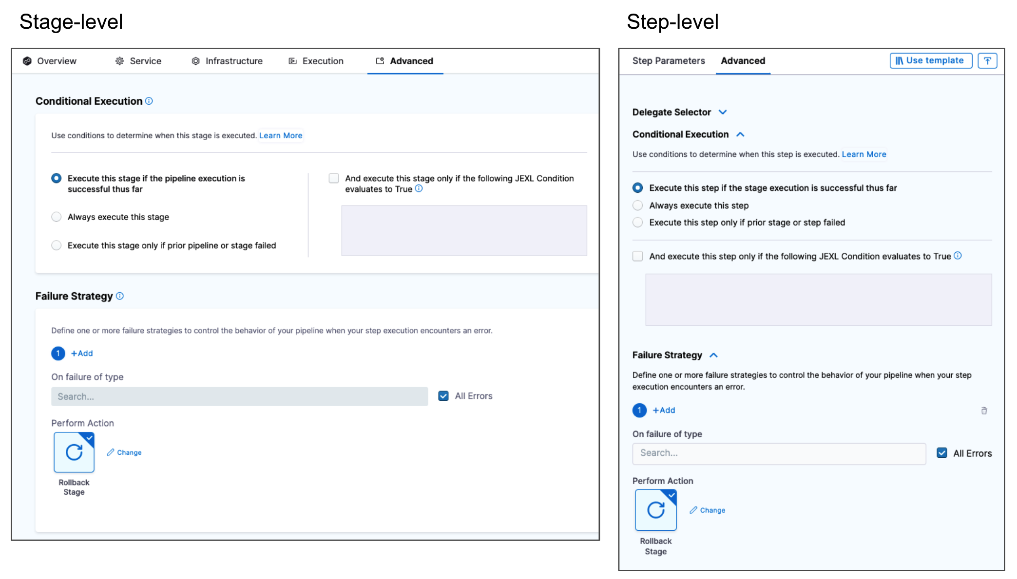 Both step and stage failure strategies include the Rollback Stage action option. There is no rollback step option.