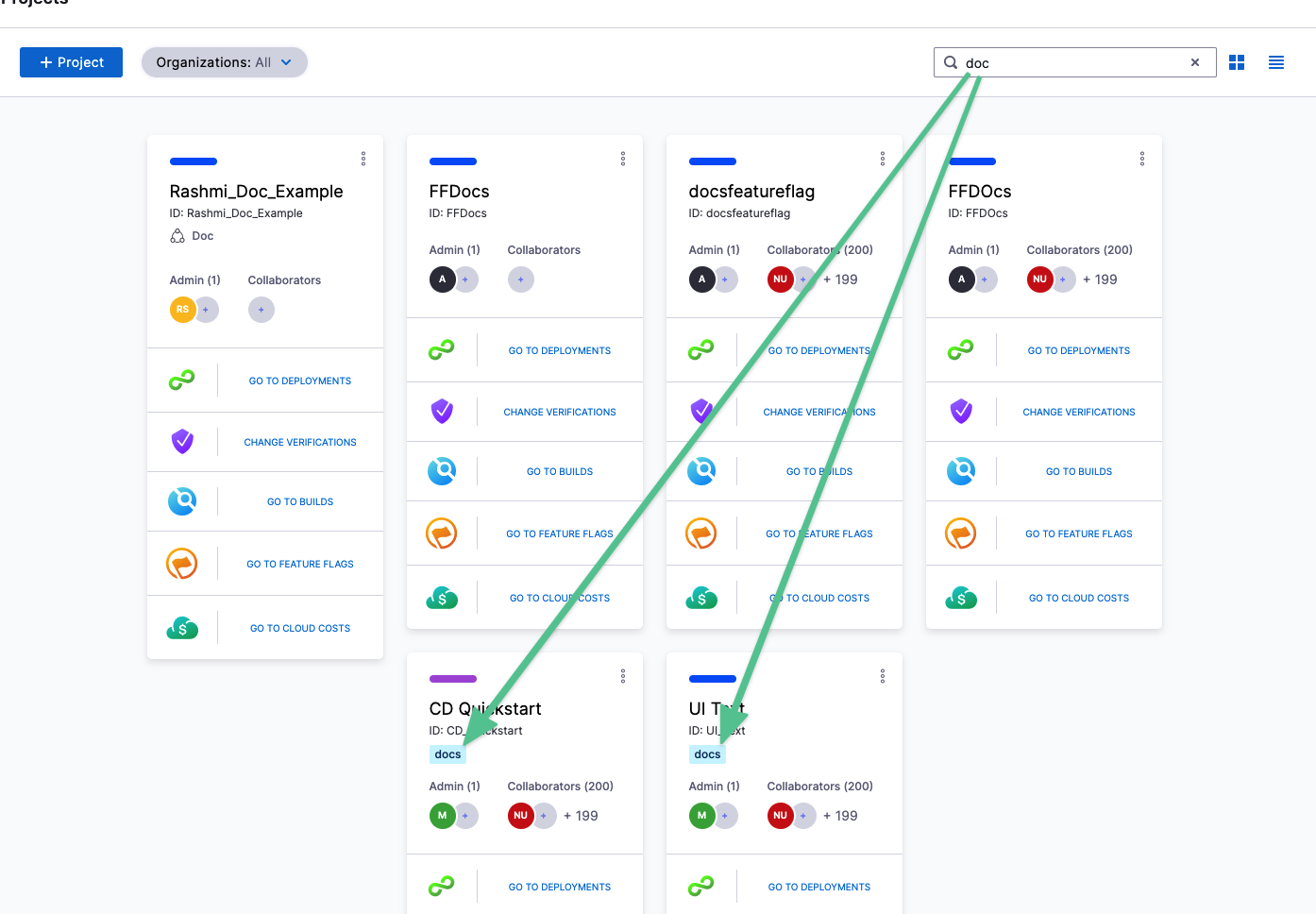 For example, the tag docs has been added to two projects. A search for doc returns projects with names and tags that match: