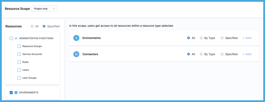 For extremely fine-grained access control, you can select individual resources within a particular resource category, such as specific connectors or pipelines. Upon selecting a resource category, select Specified, and then select Add to select specific instances of that resource.