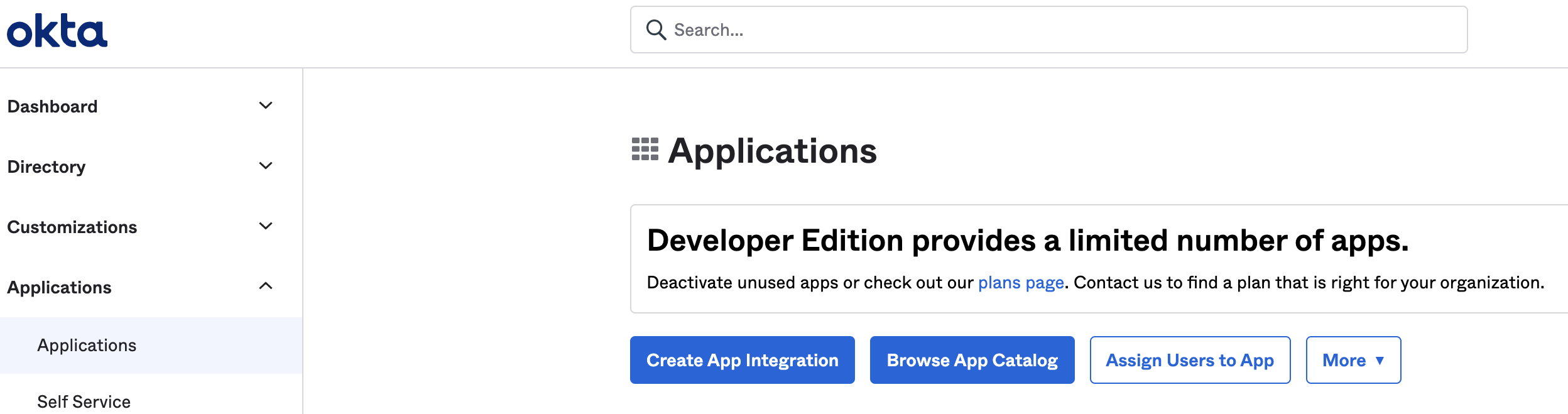 Log in to your Okta administrator account, select Applications, and select Create App Integration.