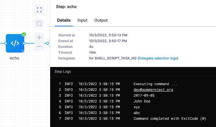 • <+pipeline.triggeredBy.email>: The email of the user who triggered the pipeline. This returns null if the pipeline is triggered using a webhook. For more information, go to Trigger How-tos.