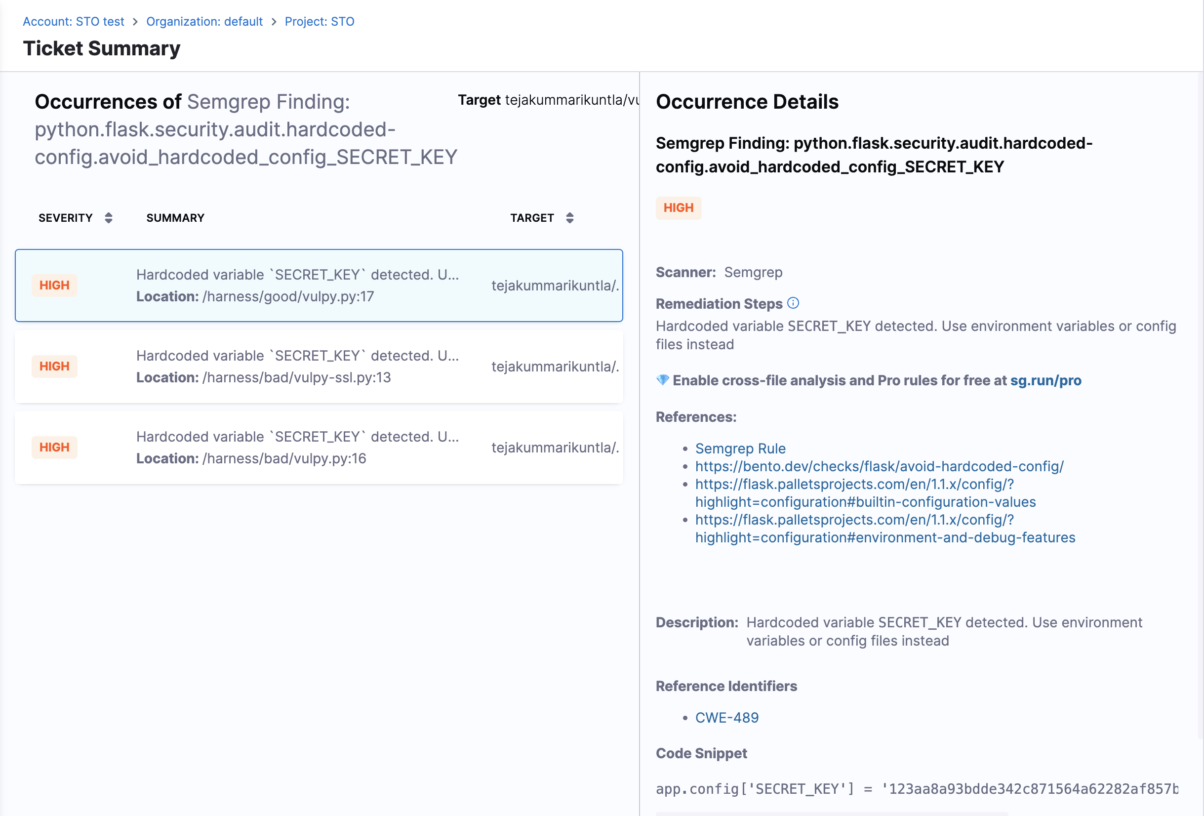 To create a Jira ticket from a security issue detected in STO scan results, follow the steps below.