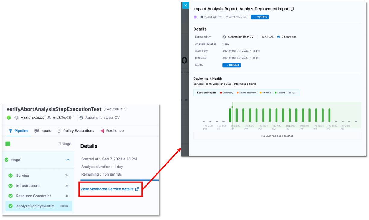 • View Monitored Service Details link. Clicking the View Monitored Service Details link opens a new tab, navigates you to the monitored service selected in the Analyze Deployment Impact step, and displays the Impact Analysis Report.