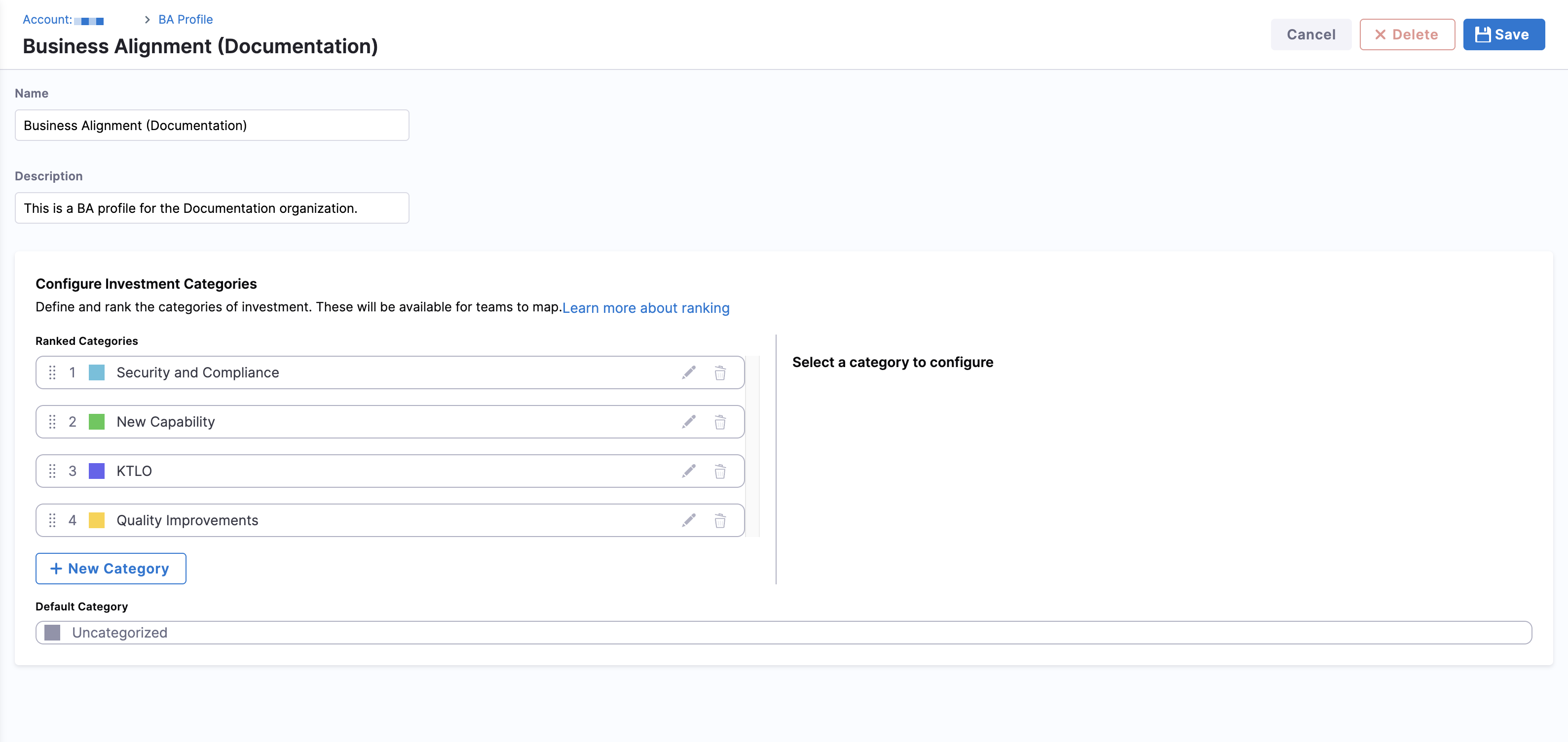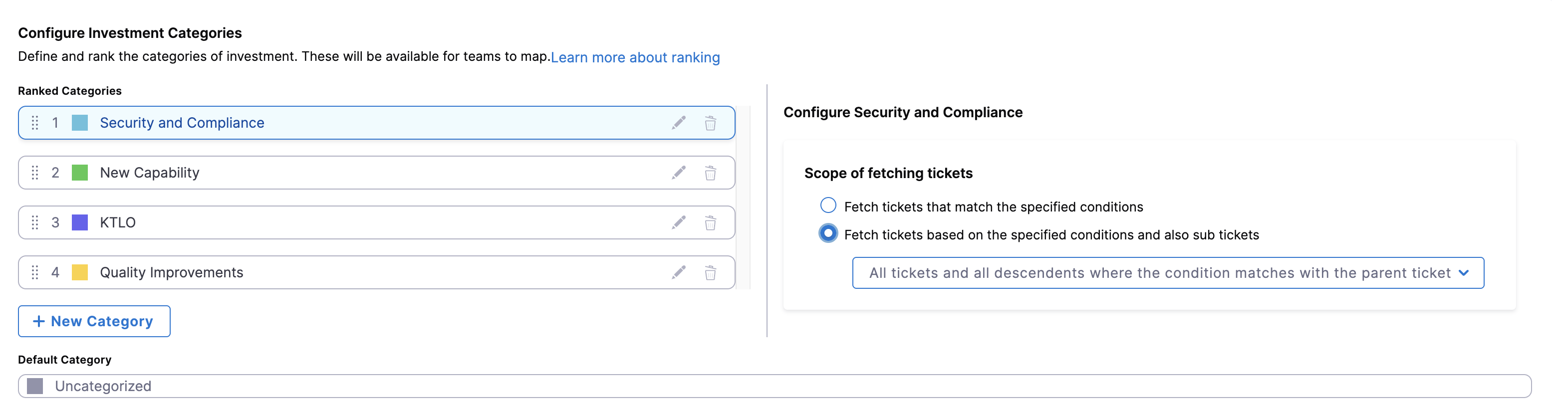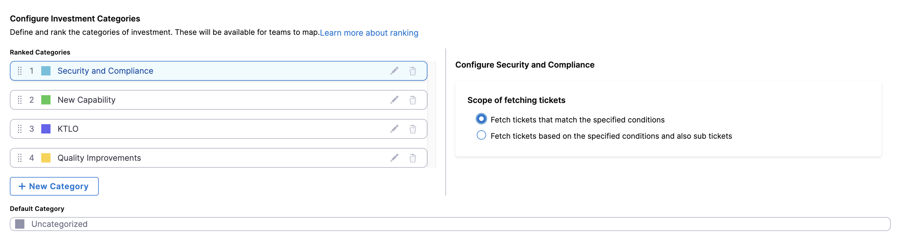 - Define the set of Investment Categories (e.g., Features, Tech Debt, Customer Commitments).
