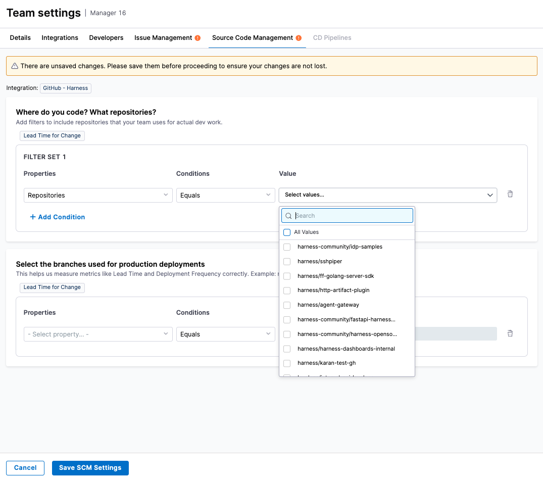 Use the Source Code Management tab in Team Settings to define which repositories, branches, and commit events are relevant for your team's coding activity and production deployments.