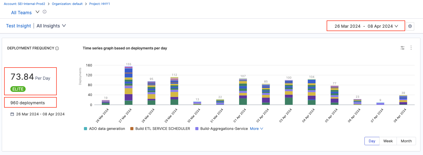 With this configuration, the Deployment Frequency widget shows the total number of times pipeline was started in the Project named SEI/Demo in the given time range.