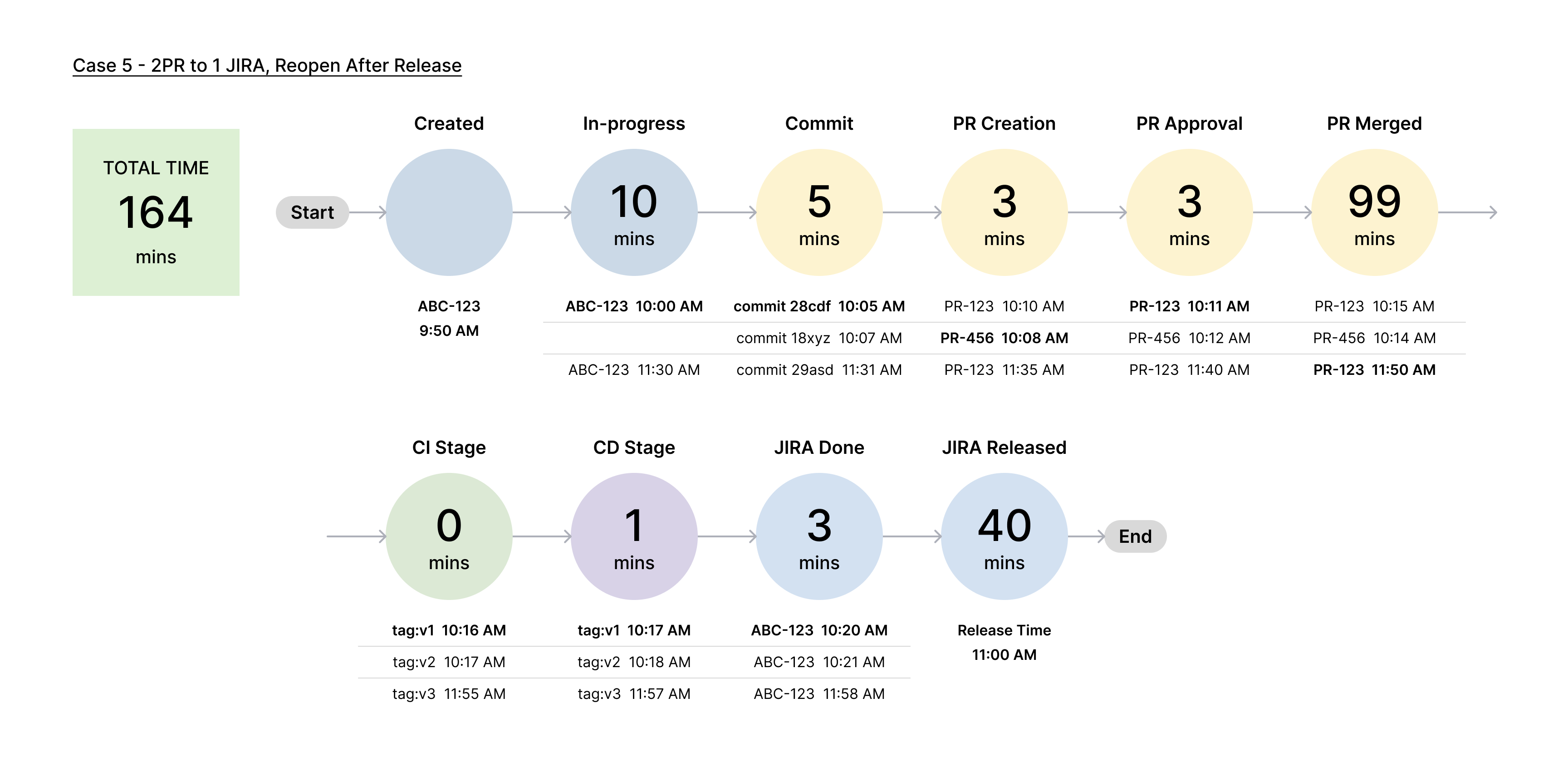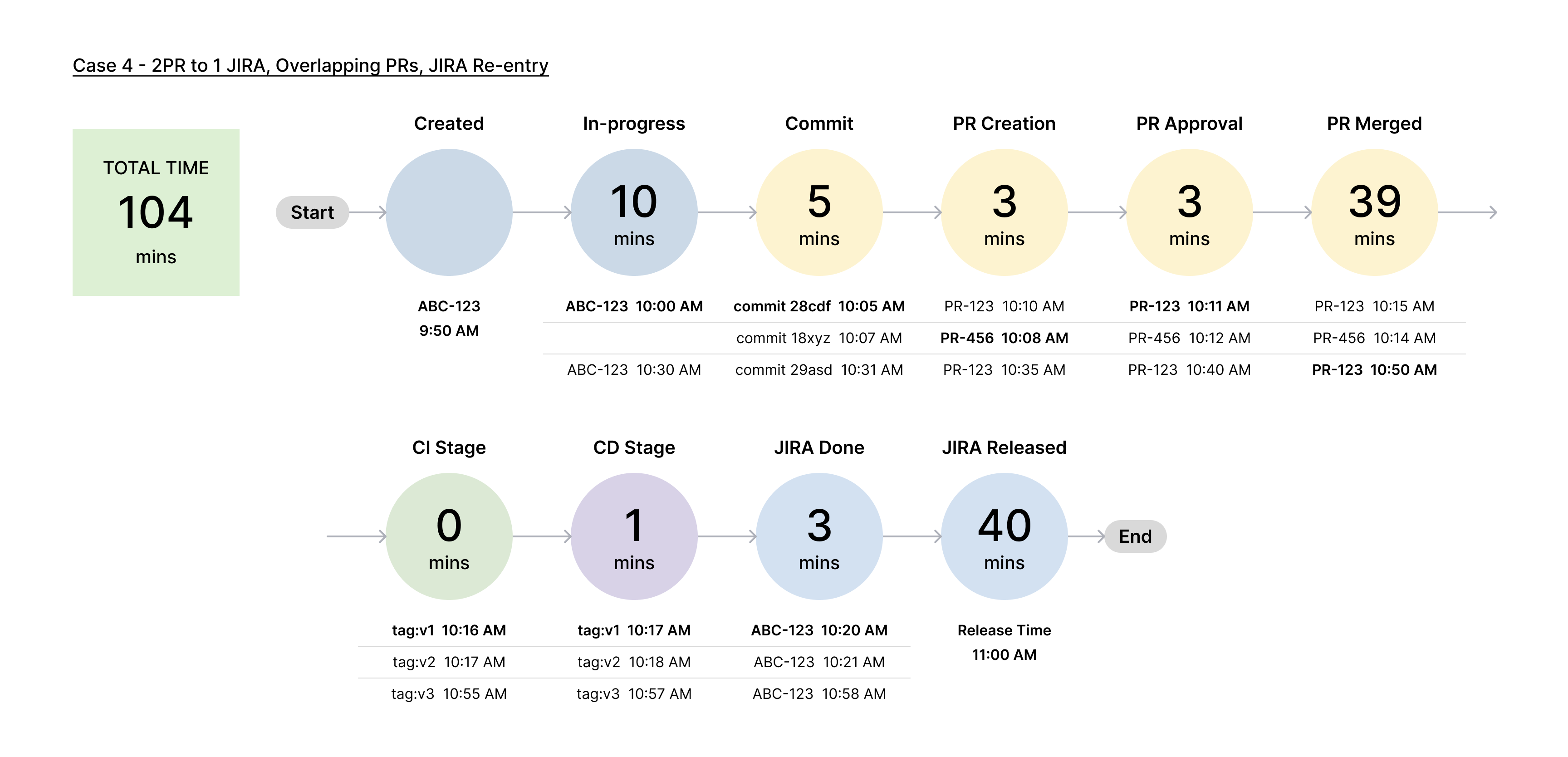 In this case, two pull requests (PRs) are associated with a single Jira ticket in an overlapping manner, and there is a re-entry into the Jira ticket after the initial completion.