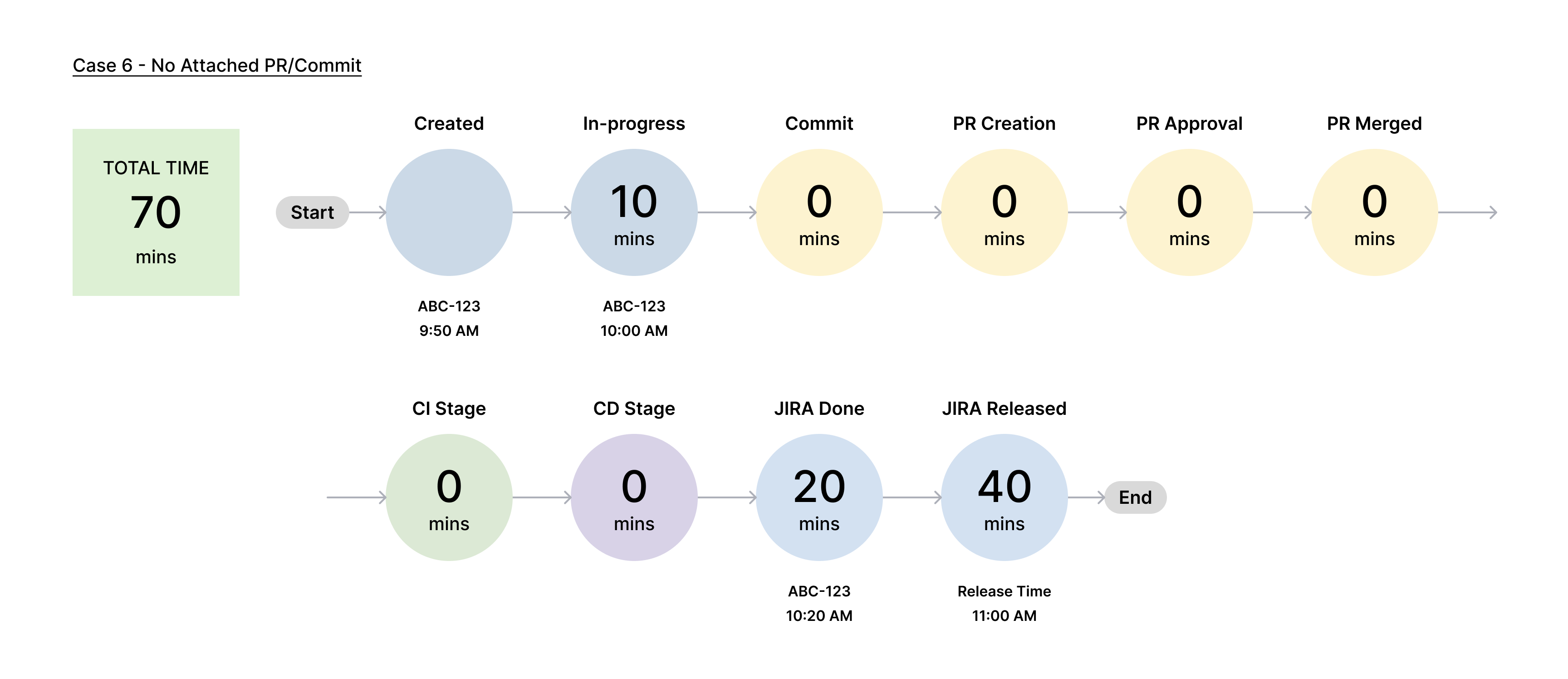 | First Commit Time | The time taken to make the first commit after the ticket was moved to the In Progress state. | First Commit Time - First In-Progress Time | 0 - 0 = 0 minutes |