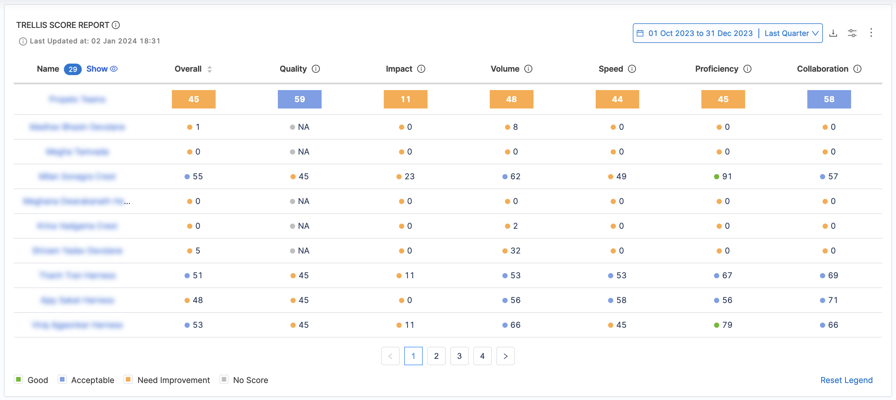 The Trellis Score Report calculates and displays the Trellis Scores by individual developers. The trellis score can be further divided into the following categories: