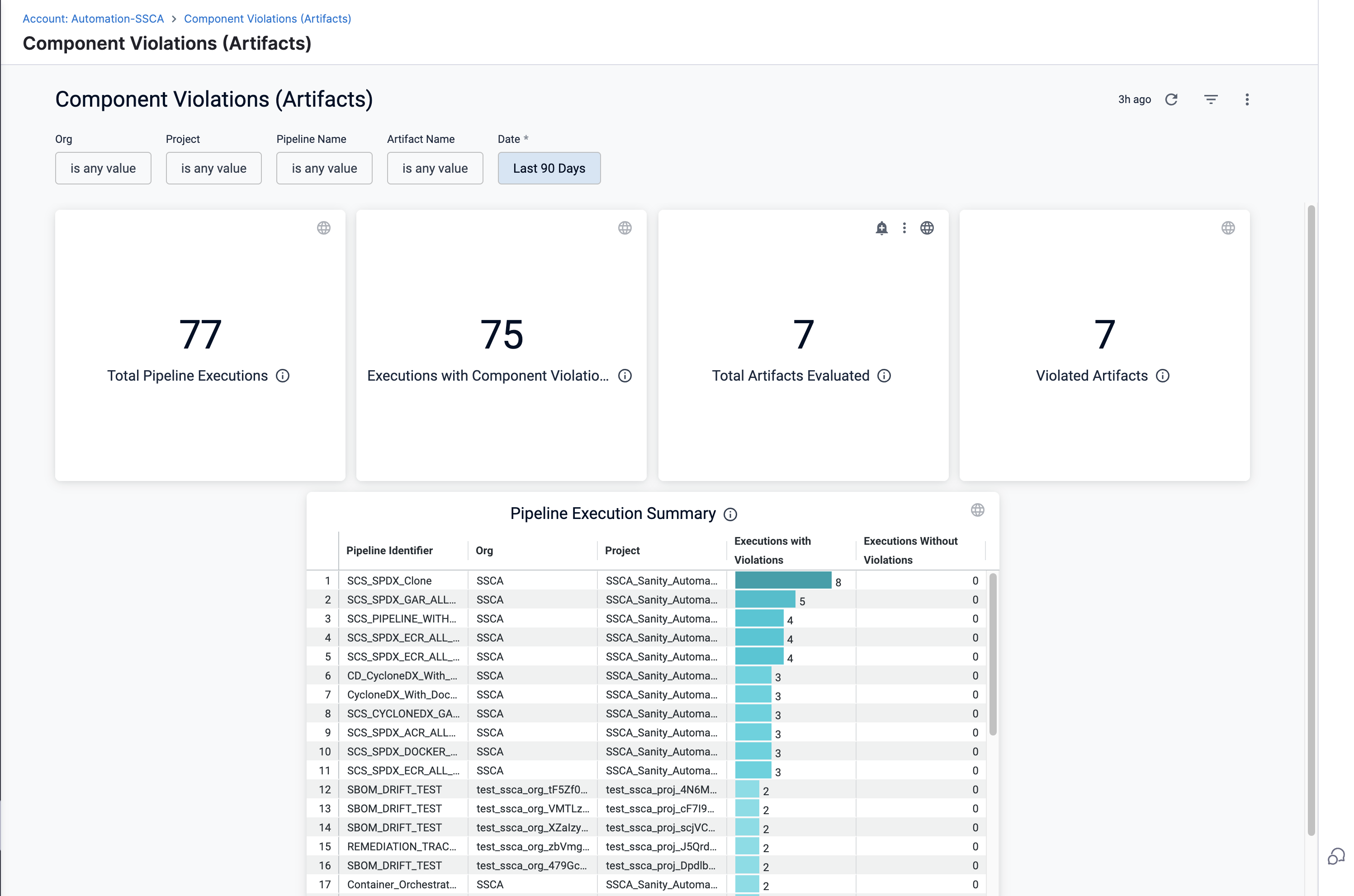 Executions With Violations: Number of pipeline executions that failed SBOM policy checks. When you Click on the violations count, this opens a pop-up table with the following columns: