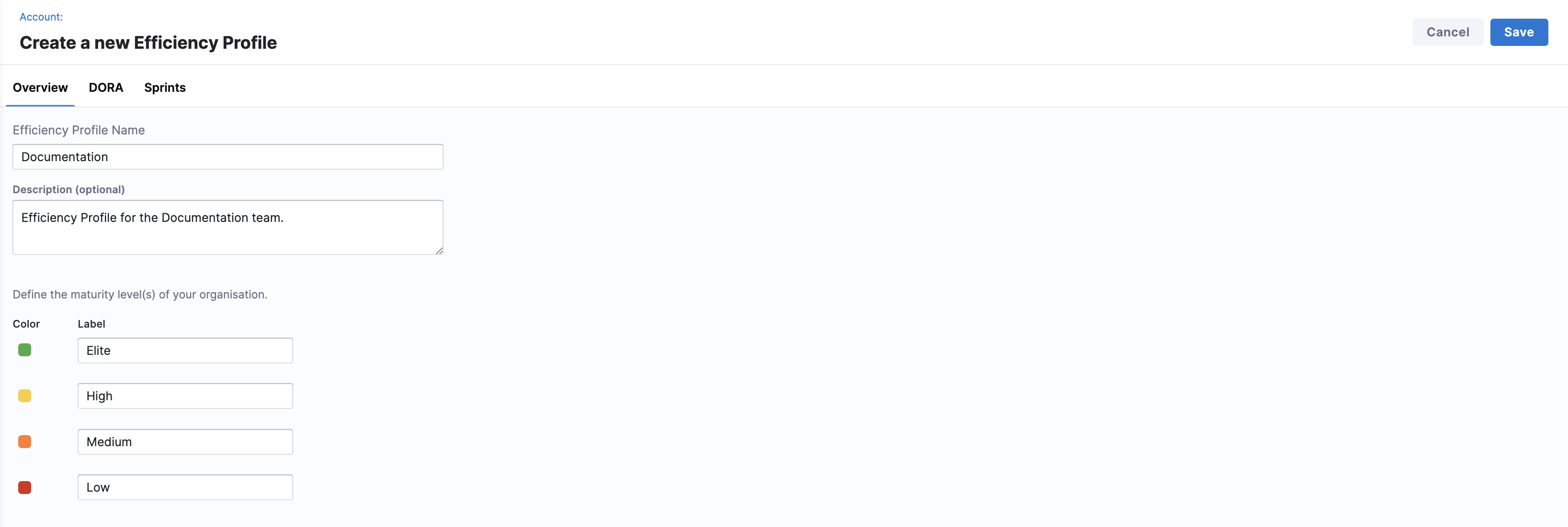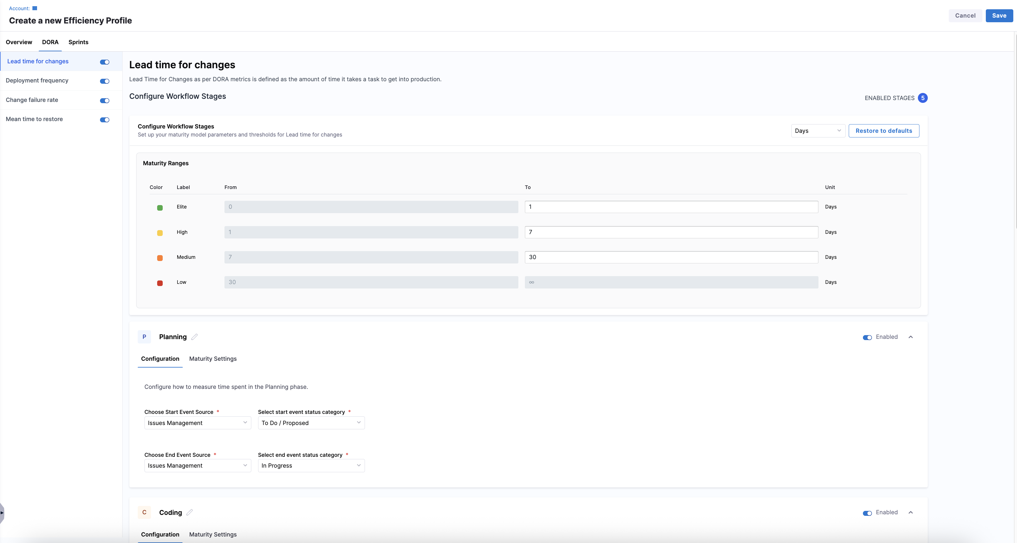 You can now define and customize maturity thresholds for DORA metrics in SEI 2.0. Organization-wide maturity levels are defined when creating or editing an Efficiency Profile, and maturity thresholds are configured by level on the DORA tab in an Efficiency Profile.