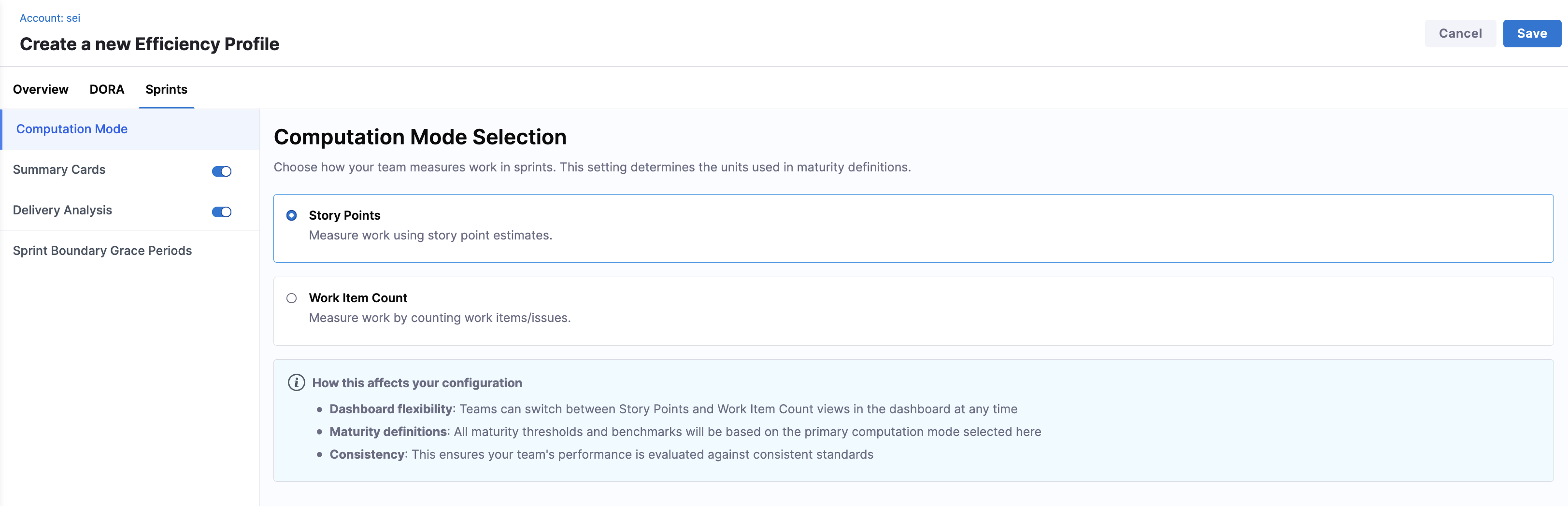 With Sprint Insights, you can configure DORA and sprint metrics in an Efficiency Profile. Sprint configuration includes how sprint work is measured, which sprint metrics are enabled, delivery performance analysis, and sprint boundary grace periods.